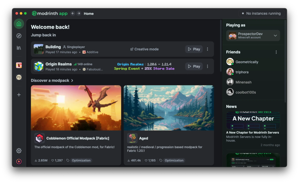 Once installed, you can create as many instances as you want (one for each modpack or playstyle). The Activity Monitor lets you watch RAM and CPU usage live, and the new Files tab makes it easy to tweak config files or check crash logs without digging through folders. Switching between instances is instant — just click the one you want and hit Play. If you follow projects on the Modrinth website, they appear in your app so you can update them with one click. Everything stays organized, fast, and simple, even if you’re running multiple modpacks at the same time.